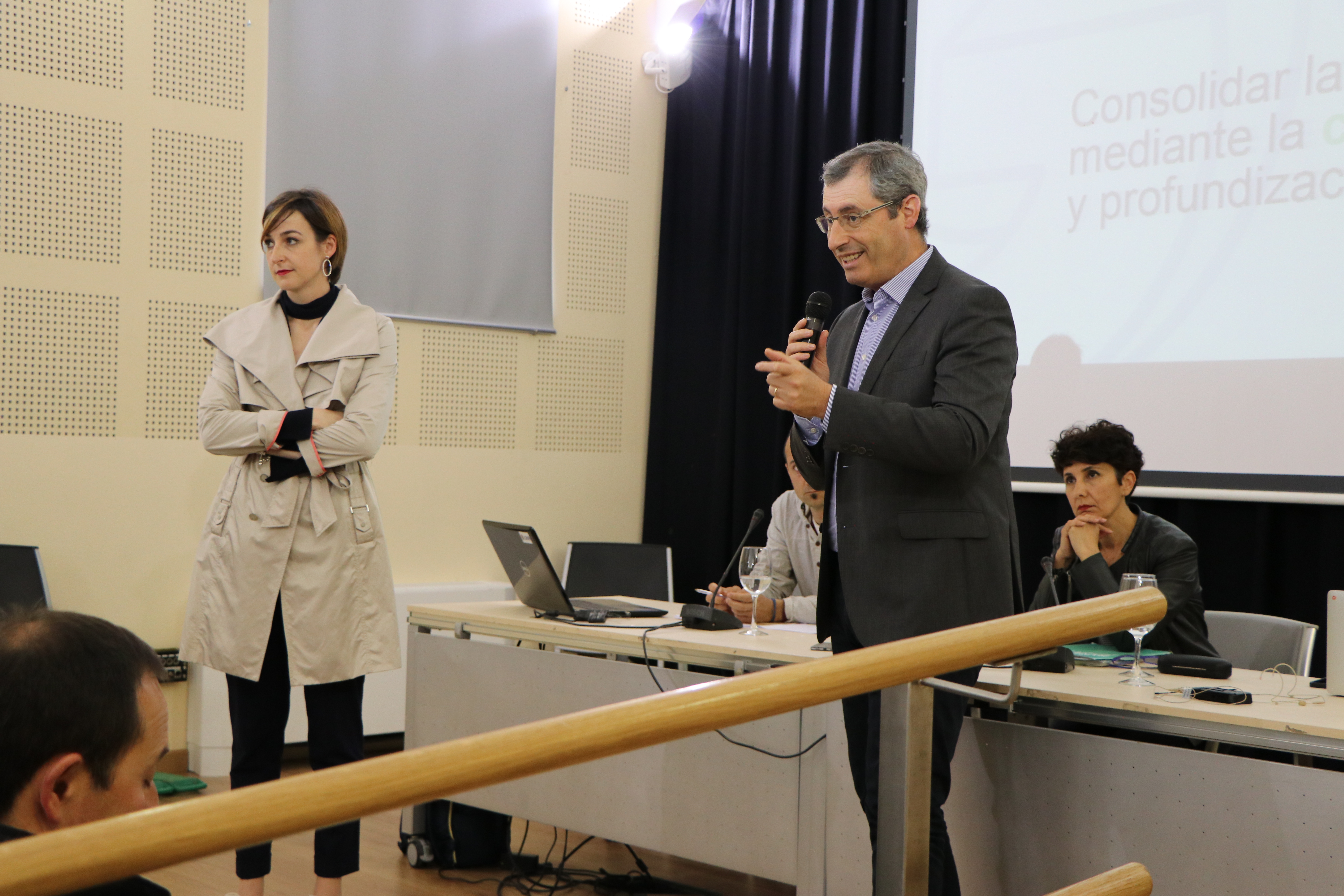 Markel Olano ha comenzado su intervención destacando la importancia de este tipo de encuentros, explicando que uno de los objetivos principales de la Diputación Foral de Gipuzkoa no es otro que “fortalecer la convivencia de la ciudadanía, profundizando para ello en la cultura política y la democracia”, Olano ha asumido esa responsabilidad, y ha subrayado que se trata de "una obligación" el construir un sistema democrático "fuerte y exigente en la defensa de los derechos humanos”. Según el diputado general, “la cultura política democrática es garantía de futuro”, ya que en Gipuzkoa debemos hacer frente “a los retos del futuro y a los conflictos venideros de manera democrática”, "por lo que necesitamos un cambio en nuestra cultura política para dar respuesta a estos retos de forma democrática". El diputado general ha continuado explicando que “durante muchos años la iniciativa social y política se ha visto limitada por la violencia, ya que en nuestro pueblo no existía un debate político normalizado que no fuera condicionado por la violencia, el miedo y la imposición”. Por ello, el diputado general ha querido dejar patente el valor de la sesión desarrollada en Arrasate, puesto que, según ha puntualizado, “todavía tenemos ciertos obstáculos para el diálogo y la cultura política”. Los objetivos de las sesiones como la de hoy son claros, en opinión del diputado general: “fortalecer la confianza, crear espacios para hablar en libertad, escuchándonos y respetándonos”.