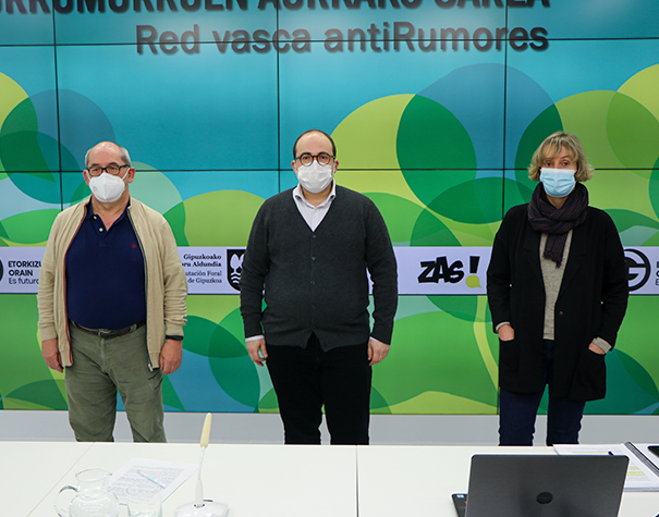 El director foral de Derechos Humanos y Cultura Democrática, Ion Gambra, y los miembros de la Red Vasca Antirrumores ZAS!, Andrea Ruiz y Xabier Aierdi, han presentado en una rueda de prensa los contenidos de esta nueva campaña. Según han informado, con el apoyo de la Diputación, ZAS! ha renovado el elemento central de su comunicación: la nueva página web www.zas.eus, apostando por un aspecto más atractivo e intuitivo centrado en los tres ejes de trabajo de la red: el eje divulgativo, el discursivo y el formativo. El objetivo de esta nueva web es ofrecer los materiales y las noticias acerca de eventos necesarios para que la ciudadanía vaya haciendo suyos estos contenidos y se sume a su estrategia como agente antirrumor.