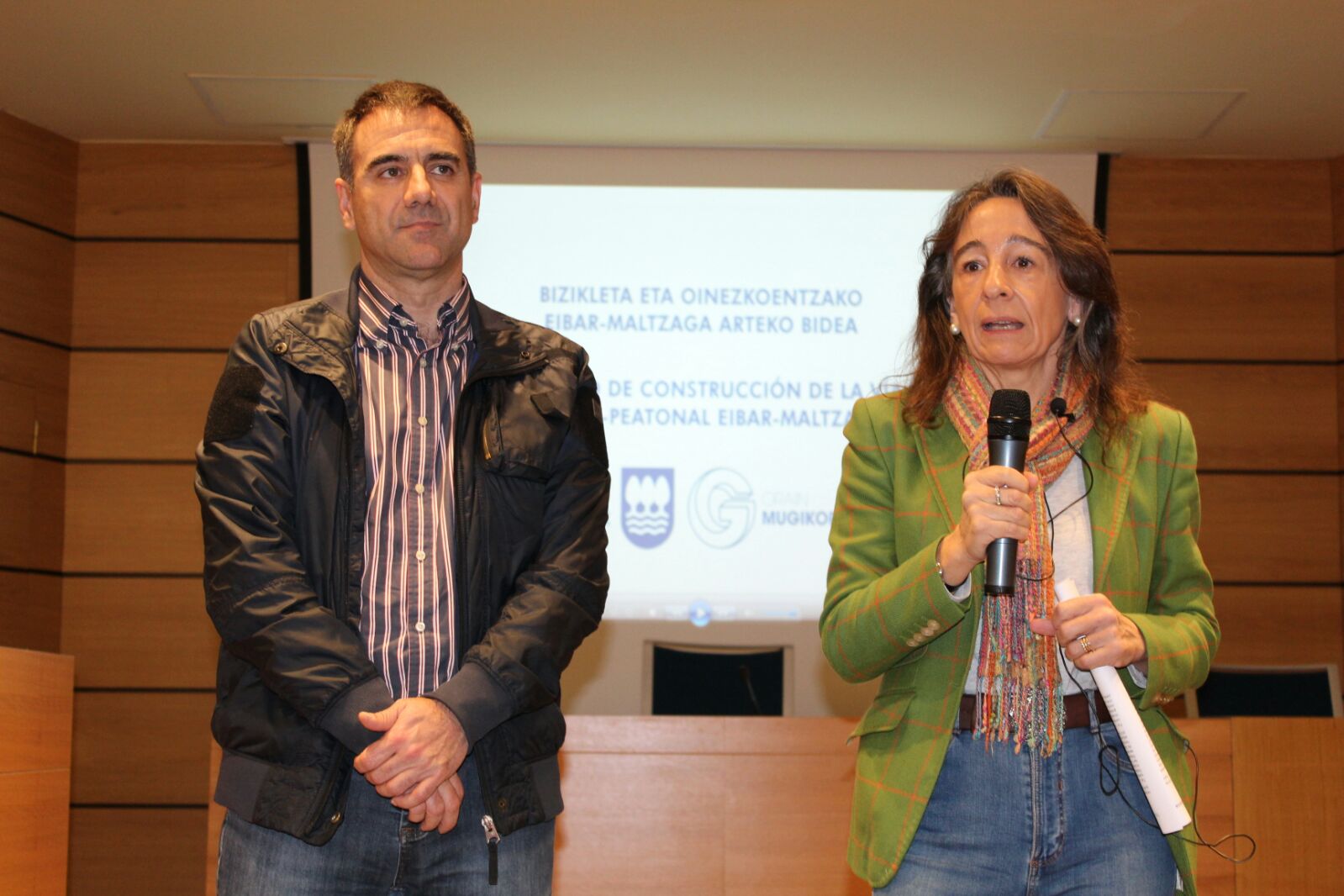 La diputada de Movilidad Marisol Garmendia y el alcalde de Eibar Miguel de los Toyos presentan el proyecto del tramo de bidegorri ciclista-peatonal de casi dos kilómetros que completarán la unión entre Eibar y Elgoibar.