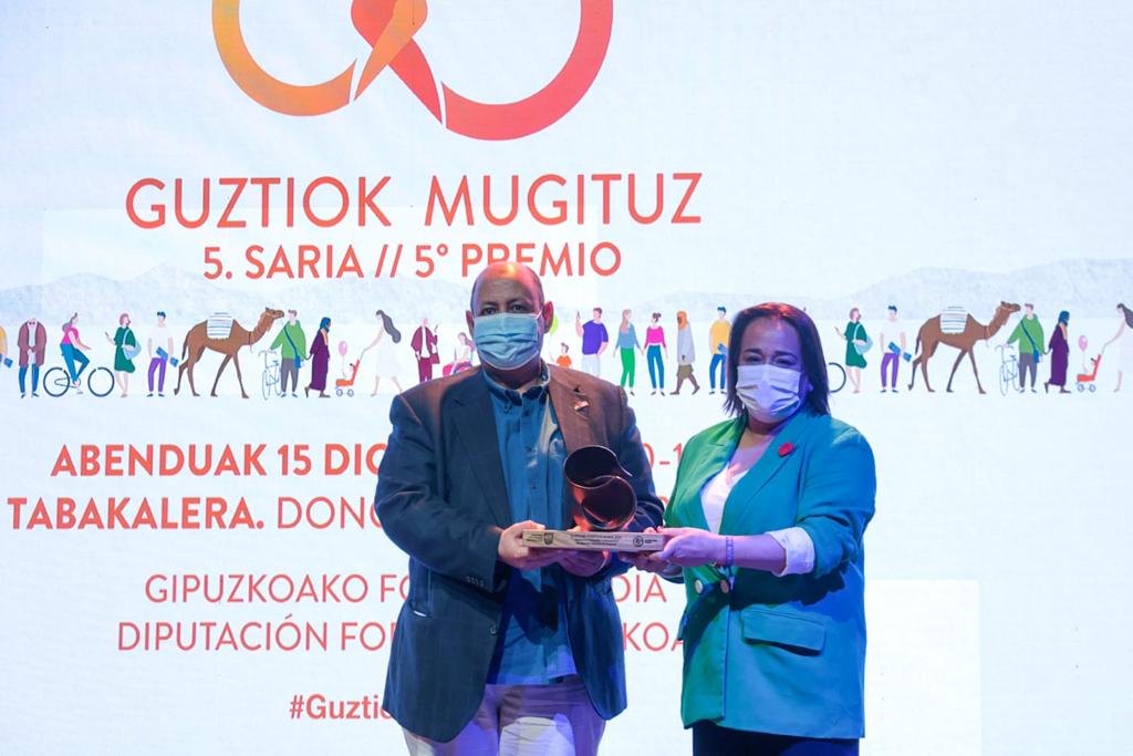 Esta tarde ha tenido lugar en Tabakalera, en San Sebastián, la entrega del Premio Guztiok Mugituz - anualmente otorgado por el Departamento de Movilidad y Ordenación del Territorio de la Diputación Foral de Gipuzkoa- que en esta quinta edición ha recaido en la Delegación Saharaui en Euskadi, en reconocimiento a su trabajo en defensa del derecho esencial de movilidad en los campos de refugiados de Tinduf.