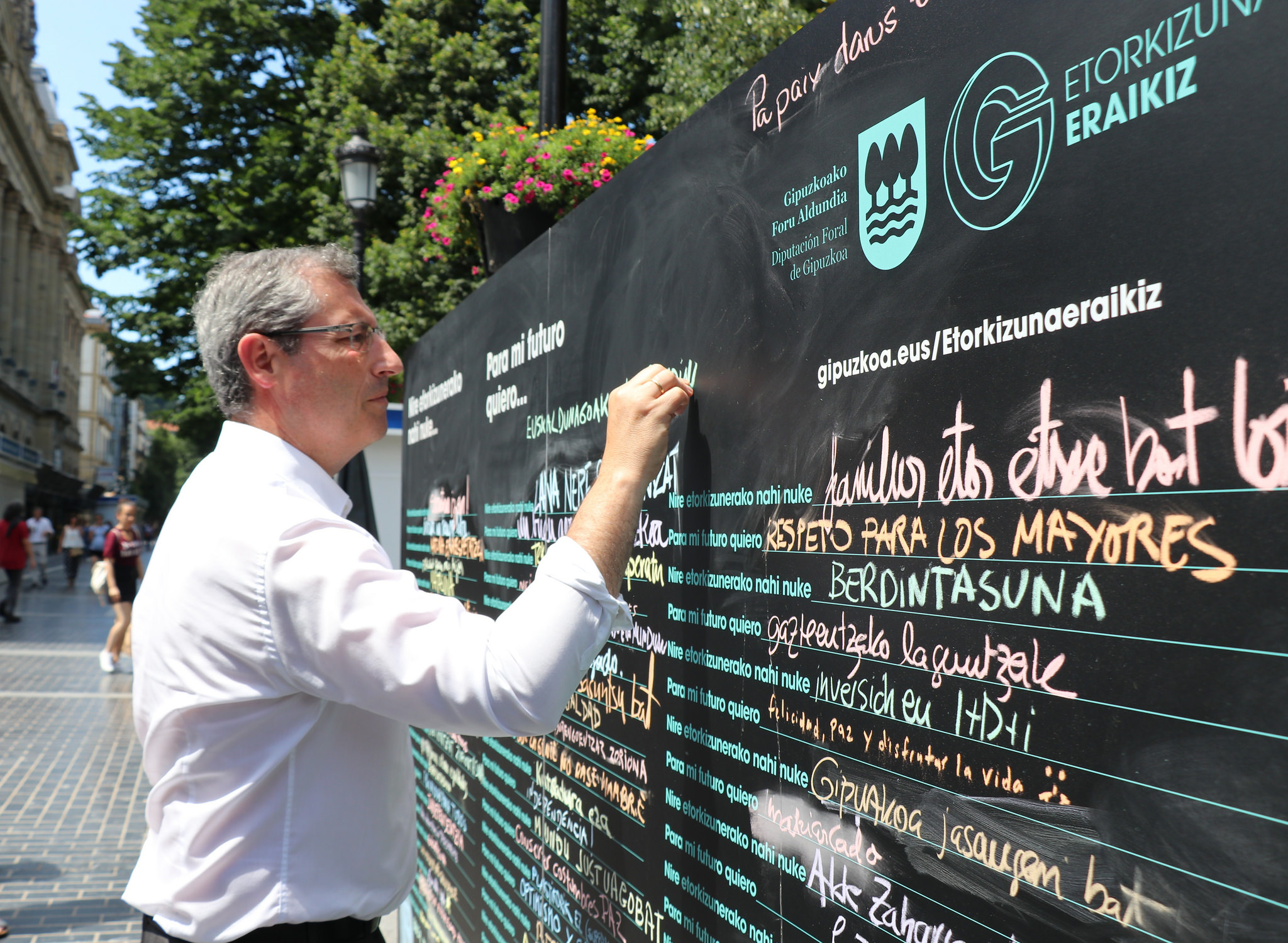 Para ello, hoy en la plaza Gipuzkoa se ha habilitado un gran panel en el que la ciudadanía puede expresar sus prioridades de futuro, y realizar propuestas en los siguientes ámbitos estratégicos: igualdad, euskera, educación, cohesión social, movilidad, envejecimiento, economía, gobernanza, cambo climático, conciliación, participación y ciberseguridad. Este panel estará mañana y pasado en San Sebastián (Zurriola y Ondarreta), y recorrerá durante julio los siguientes municipios: Ordizia, Elgoibar, Irun, Beasain, Andoain, Azpeitia, Pasaia, Hondarribia, Tolosa, Arrasate, Zarautz, Eibar y Errenteria. Además, con el fin de combinar los canales presenciales con las nuevas tecnologías, se ha habilitado una plataforma en la web para recoger las aportaciones ciudadanas: Etorkizuna Eraikiz.