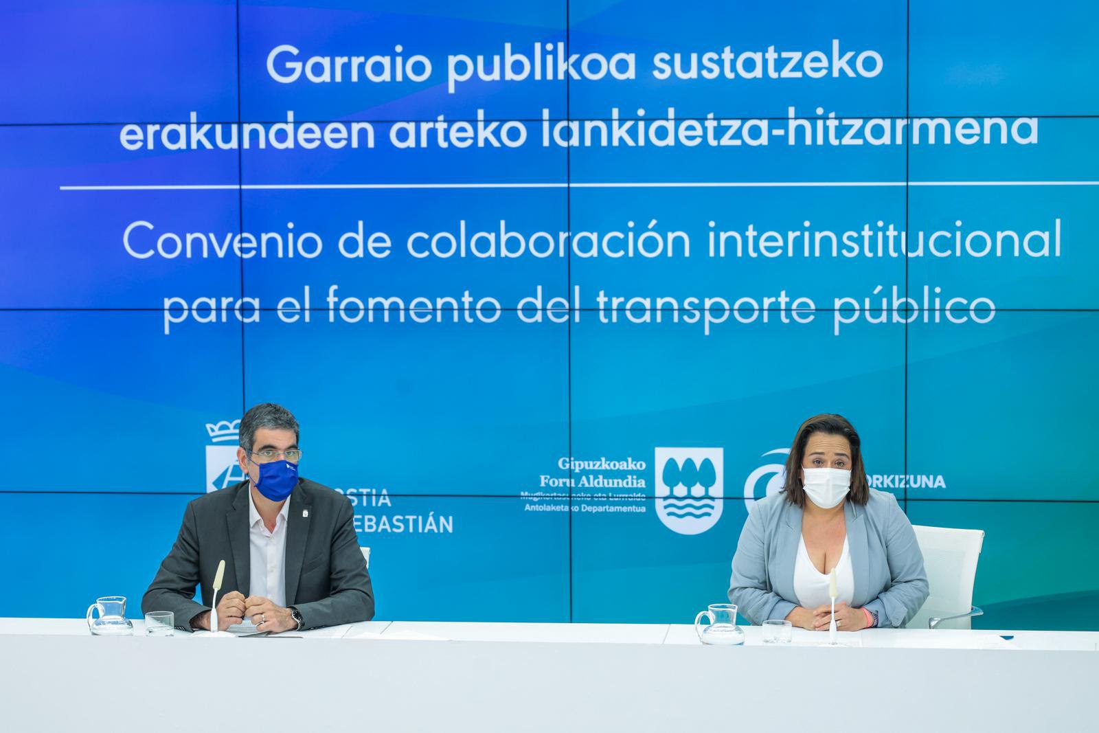 La Diputada de Movilidad y Ordenación del Territorio de la Diputación Foral de Gipuzkoa, Rafaela Romero, y el alcalde de Donostia / San Sebastián, Eneko Goia, han presentado esta mañana en rueda de prensa el nuevo acuerdo de colaboración interinstitucional entre la Diputación Foral de Gipuzkoa y el Ayuntamiento de San Sebastián en lo relativo a la gestión del transporte público y la movilidad urbana. Un convenio histórico dotado de 650.000 euros para el desarrollo de acciones y programas del Plan de Movilidad Urbana Sostenible de la ciudad, que sienta las bases de la nueva movilidad para el territorio de Gipuzkoa.