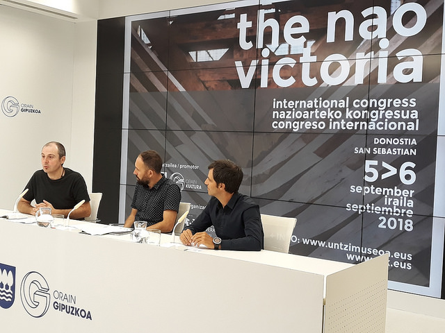 El Diputado de Cultura y Turismo de la Diputación Foral de Gipuzkoa Denis Itxaso, Xabier Alberdi Lonbide, director del Congreso y director científico del Museo Naval, y Raúl Pérez Iratxeta, director general del Museo Naval, han presentado ante los medios de comunicación el Congreso Internacional “Estudio y análisis del contexto tecnológico de la nao Victoria, en el marco de la primera circunnavegación de la tierra”.