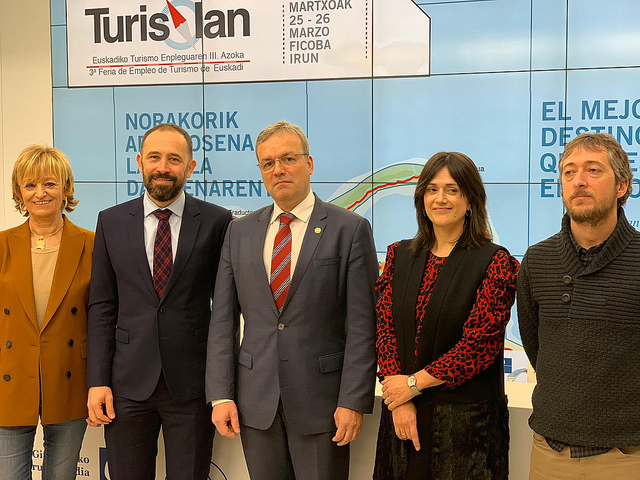 El Diputado de Cultura y Turismo, Denis Itxaso y el Consejero de Turismo, Alfredo Retortillo han presentado la tercera edición de la Feria de Empleo del Turismo en Gipuzkoa, Turislan que este año pasa de ser la Feria de Gipuzkoa a la Feria Vasca del empleo del Turismo. Se celebrará en Ficoba los días 25 y 26 de marzo con el fin de crear empleo profesional y de calidad y mejorar así la competitividad del destino y del sector. En la rueda de prensa también han estado Patxi Arrazola, representante de la Asociación de Agencias de Desarrollo local del País Vasco GARAPEN, Ane Miren Axpe, Directora comercial eventos Ficoba y Maite Cruzado, directora foral de Turismo.