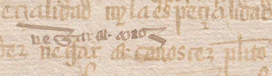 Testamento de Domenja de Berrasoeta, combinación de las letras del aprendiz y del notario en los huecos dejados por el aprendiz o amanuense. En la última línea se puede observar una corrección del notario debida al olvido de parte del texto que debía haber copiado el aprendiz.