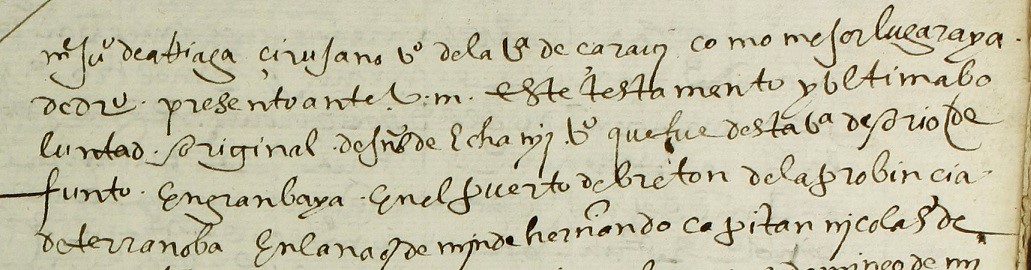 ‘M(aes)e J(ua)n de Arriaga, çirujano, v(ecin)o de la v(ill)a de Çarauz, como mejor lugar aya / de d(e)r(ech)o presento ante V.M. este testamento y ultima vo-/luntad original de J(oa)n(e)s de Echaniz v(ecin)o que fue de esta v(ill)a de Orio de-/funto en Gran Baya, en el puerto de Breton de la probincia/ de Terranoba, en la nao de Martin de Hernando, capitan Nicolas de…’