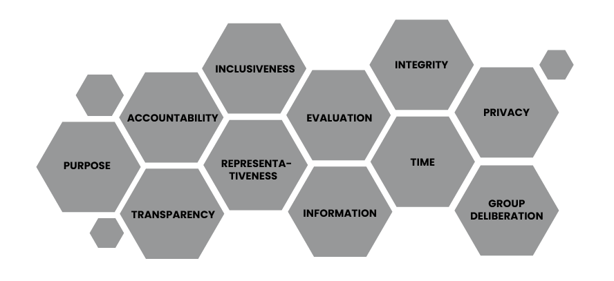 Transparencia: antes de iniciar el proceso de deliberación, los agentes promotores y la organización comanditaria presentarán el proyecto al público. El diseño del proceso y todos los materiales (incluidos cronogramas, informes, información y datos presentados, audio y video de las presentaciones, el informe elaborado por los participantes y sus recomendaciones -que se redactarán con las palabras de los participantes- y las descripciones de las metodologías utilizadas por los ciudadanos seleccionados al azar) se compartirán después de las sesiones en el sitio web del proyecto.