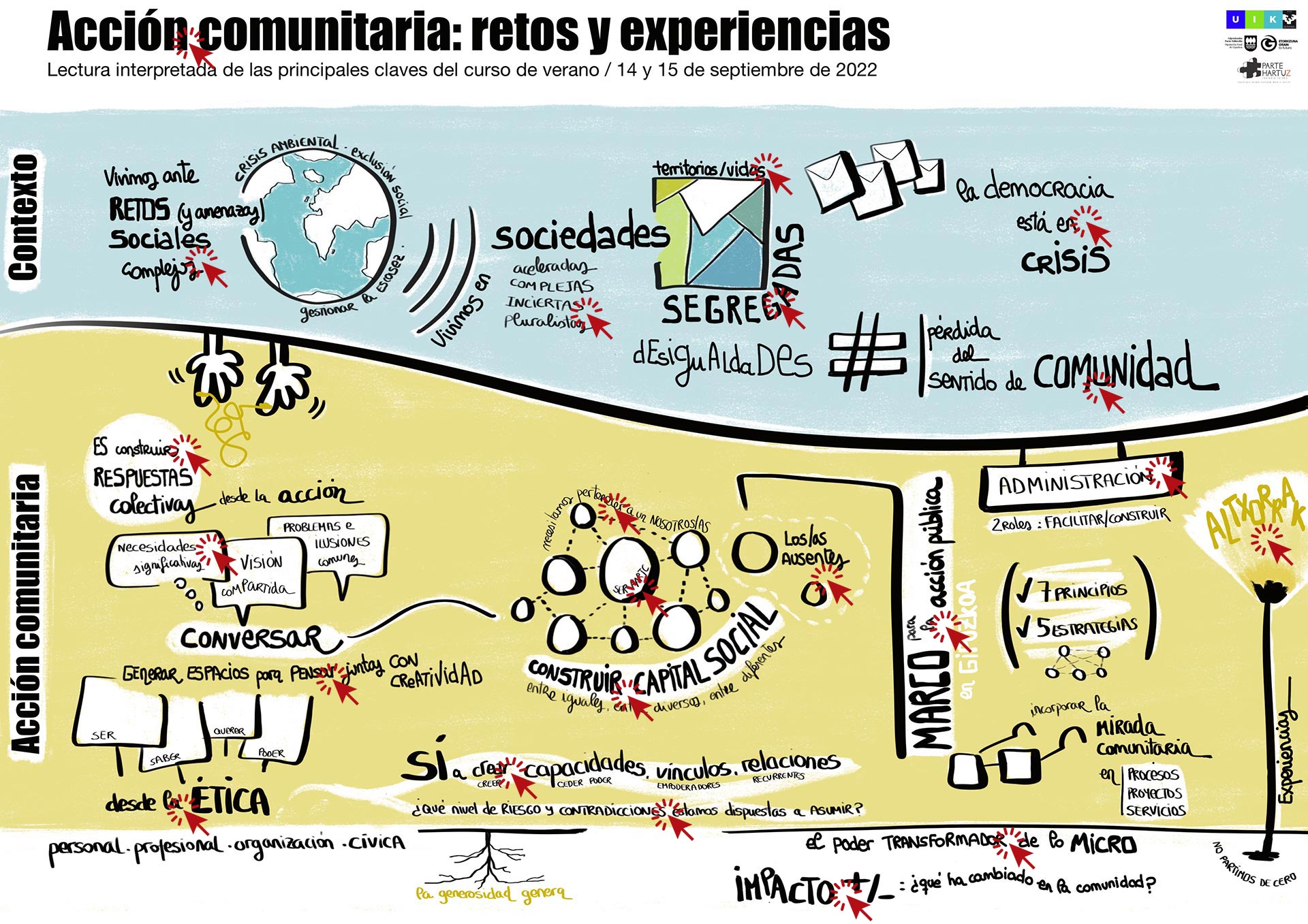 Haz clic sobre los conceptos que señalan las flechas rojas si quieres conocer los vídeos con las claves del curso de verano "Acción Comunitaria: retos y experiencias"
