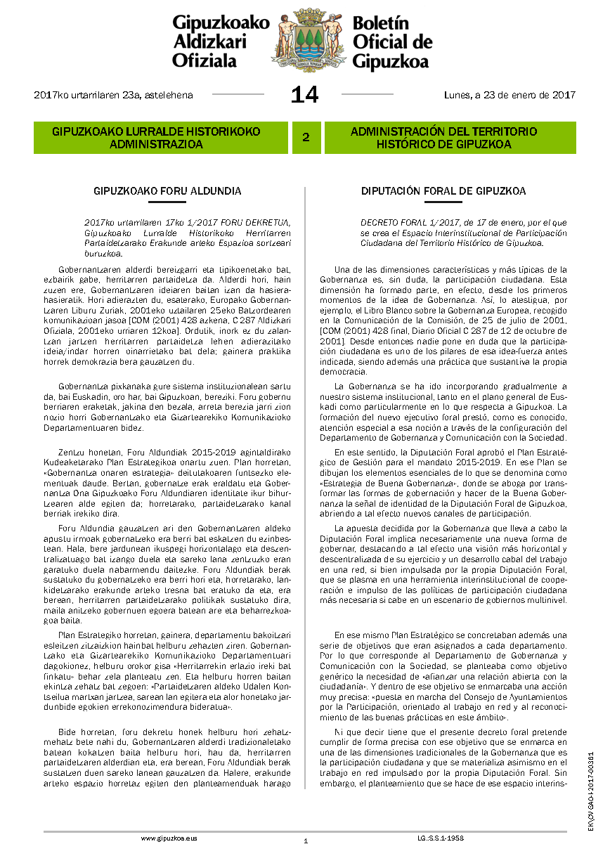 Decreto Foral 1/2017, de 17 de enero, por el que se crea el Espacio Interinstitucional de Participación Ciudadana del Territorio Histórico de Gipuzkoa
