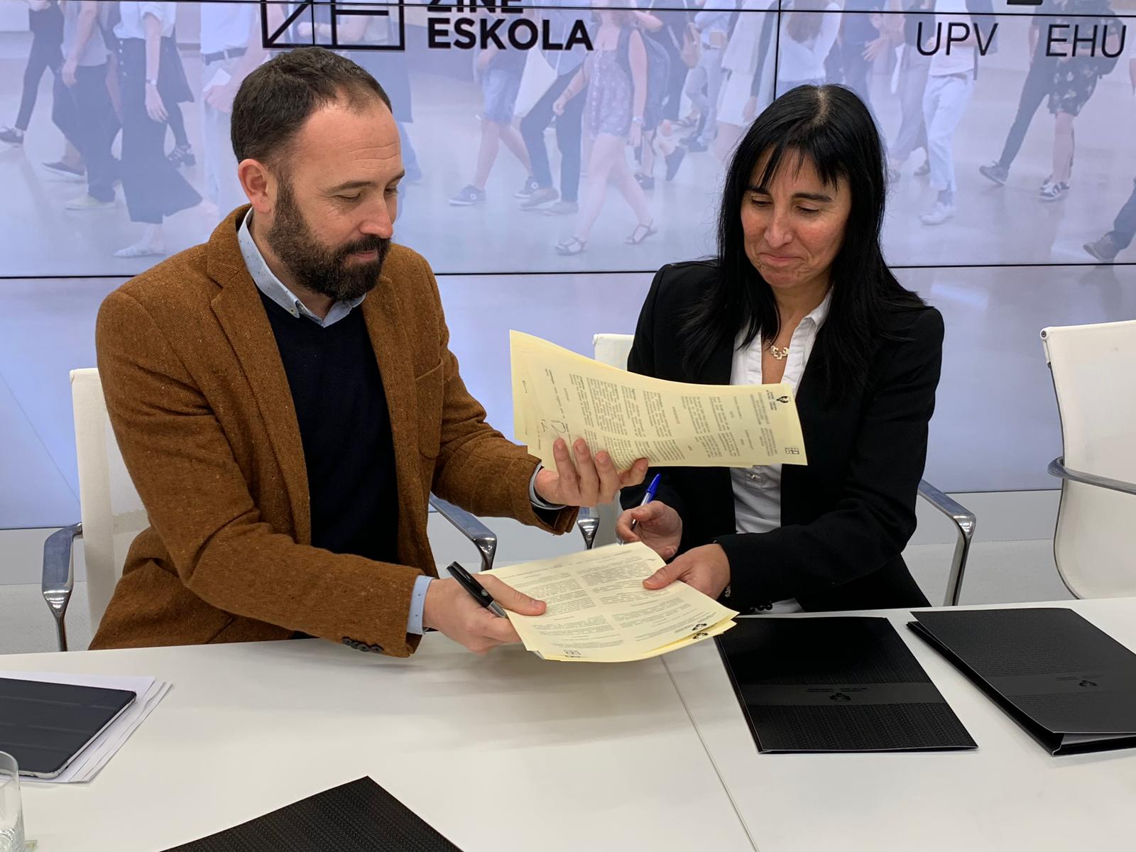 UPV/EHU-ko Errektore den Nekane Balluerkak eta Kulturako Diputatuak, Denis Itxasok Elias Querejeta Zinema Eskola Euskal Unibertsitatera atxikitzeko hitzarmena sinatu dute gaur.