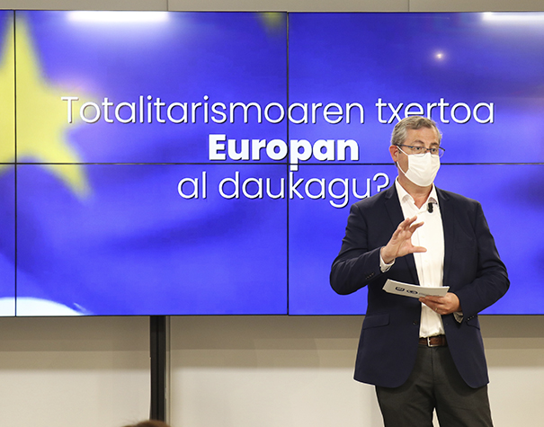 Diputatu nagusiak gaur goizean Etorkizuna Eraikiz Gunean egin den ‘Totalitarismoaren txertoa Europan ote dugu?’ jardunaldian hartu du parte, Europaren Egunaren harira antolatu dena. Bertan, aditu ezberdinek Europarekin lotura duten gaurkotasuneko gai ezberdinak jorratu dituzte. Honela, Nerea Magallon Zuzenbidean doktoreak Europako gobernantzaren erronkak eta Garapen Jasangarrirako Helburuei buruz jardun du; Carmen Salcedo Valentzia Unibertsitateko irakasleak, giza eskubideei buruz; Maria Jose Sanz biologian doktoreak aldaketa klimatikoari buruz jardun du; Maite Alonso Jaurlaritzako sailburuorde ohiak hezkuntza erronkak izan ditu hizpide; Leyre Arrieta Historia Garaikidean doktoreak Euskadik Europan duen parte hartzea aztertu du; eta azkenik, Arola Urdangarin Akitania Berria, Euskadi, Nafarroako Euroeskualdeko zuzendaria mugaz gaindiko lankidetzaz aritu da.