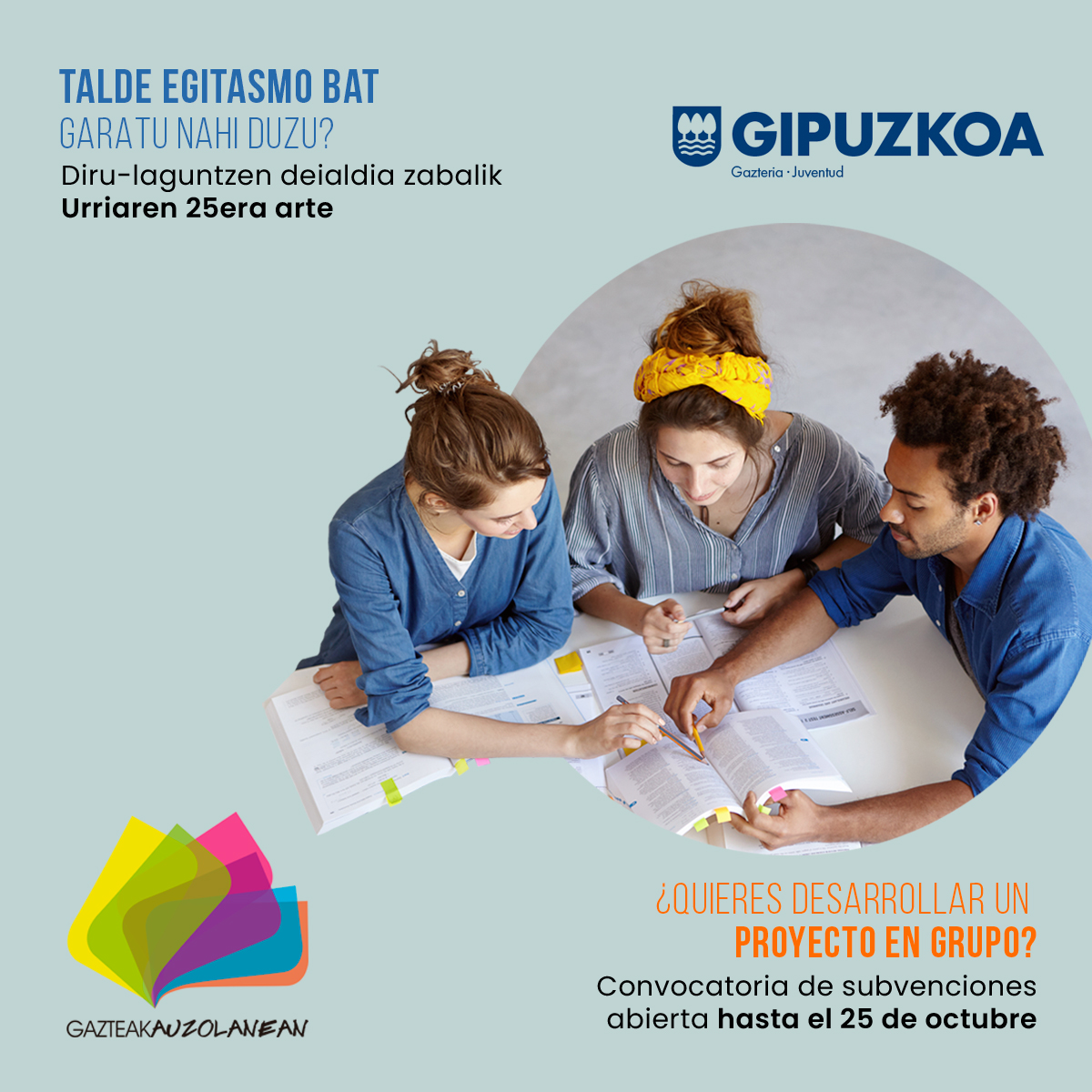 Aurten ere, Gipuzkoako Foru Aldundiko Gazteria Zuzendaritzak Gazteak Auzolanean dirulaguntza-programaren edizio berri bat martxan jarri du. Helburua da proiektu kolektibo bat sortu eta garatu nahi duten 18 eta 30 urte bitarteko gazteei babesa ematea.