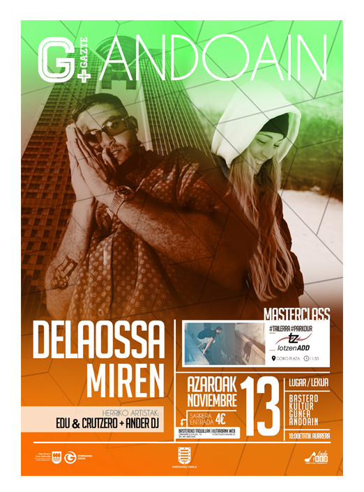 Gipuzkoan Gazte Tour ekimenak sorkuntza urbanoko hainbat proposamen ekarriko ditu Andoainera hurrengo larunbatean, azaroaren 13an. Parkour emanaldi ireki eta doako batekin hasiko da eguna. Arratsaldean, Bastero Kulturgunean, bertako EDU, Crutzero eta DJ Ander hirukotearen eta Miren eta Delaossa artisten eskutik kontzertuak egongo dira. Musika jaialdirako sarrerak 4 eurotan daude jada salgai Basteroko leihatiletan eta Kutxabanken webgunean.