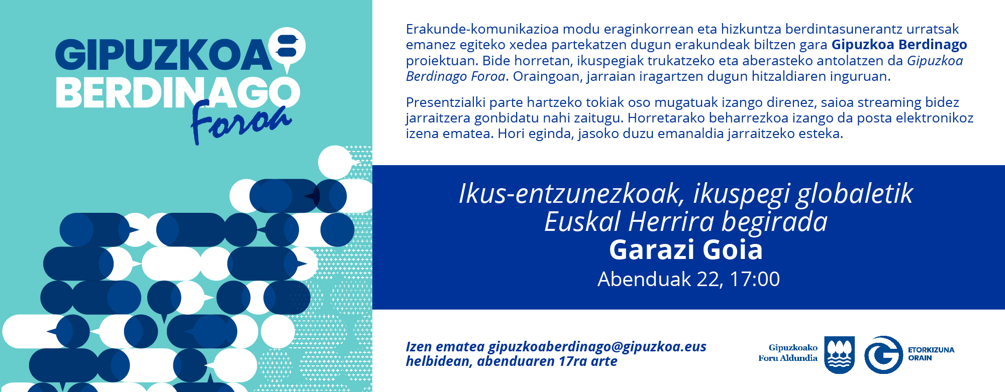 Erakunde-komunikazioa modu eraginkorrean eta hizkuntza berdintasunerantz urratsak emanez egiteko xedea partekatzen dugun erakundeak biltzen gara Gipuzkoa Berdinago proiektuan. Bide horretan, ikuspegiak trukatzeko eta aberasteko antolatzen da Gipuzkoa Berdinago Foroa.