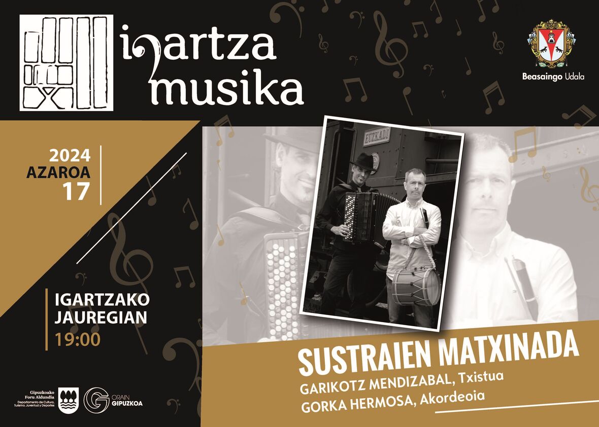 Igartza Musika Zikloaren 2024ko 2.seihilekoaren programa jarraituz, Garikoitz Mendizabal txistulariak eta Gorka Hermosa akordeoi joleak SUSTRAIEN MATXINADA eskainiko dute Igartzako jauregian 19:00tan.