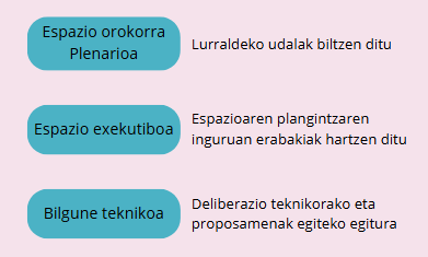 - Laguntza eta lankidetza teknikorako bideak hedatzea Espazioan dauden erakundeek betebehar arauemaileak egikaritzeko, araudiak eta ordenantzak onartzeko eta herritarren partaidetzarako metodologiak, prozesuak eta tresnak martxan jartzeko.